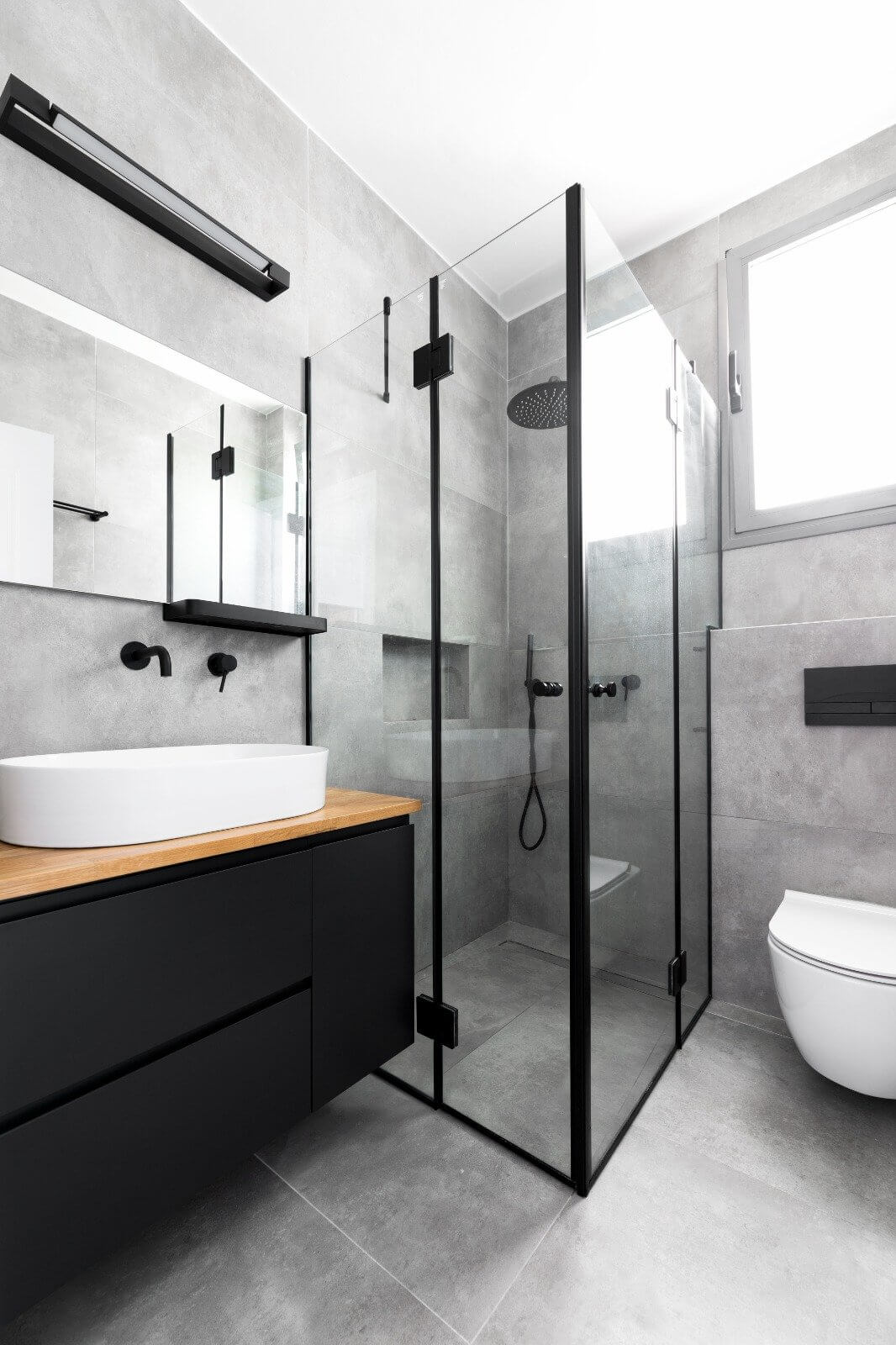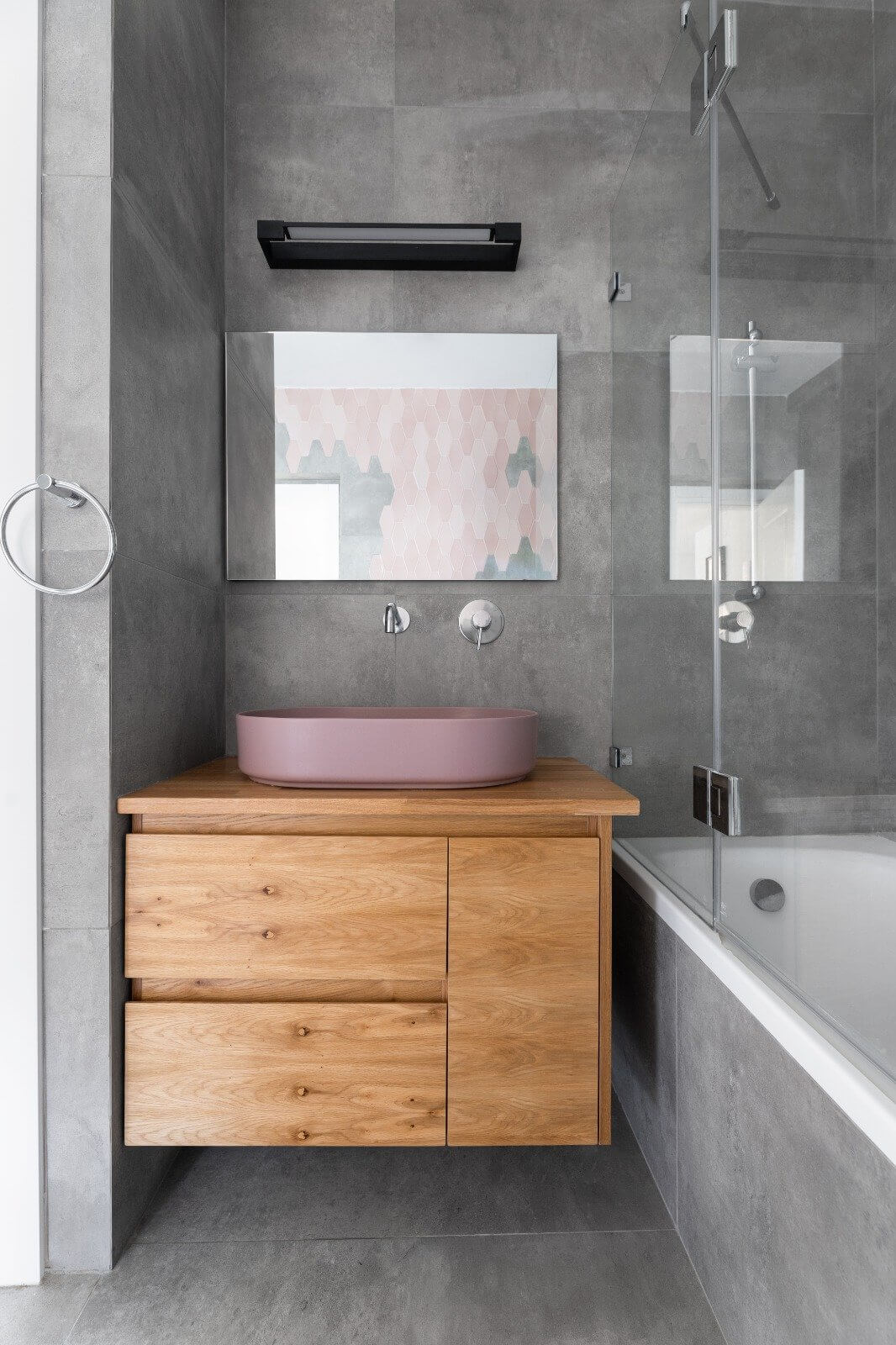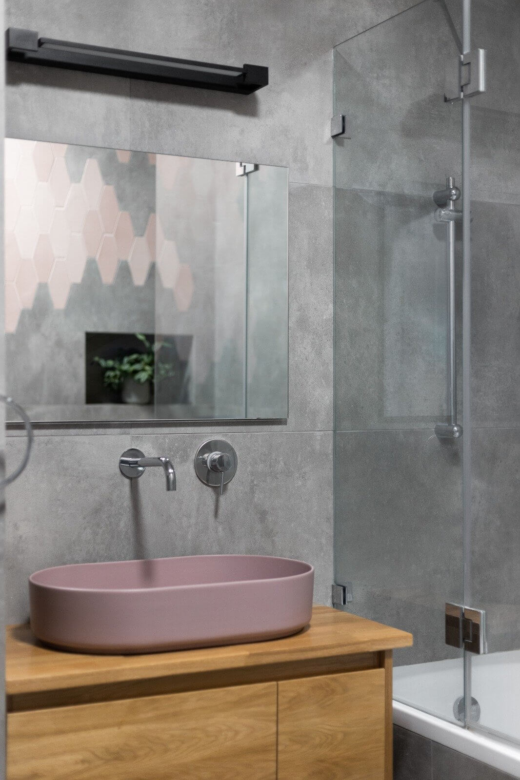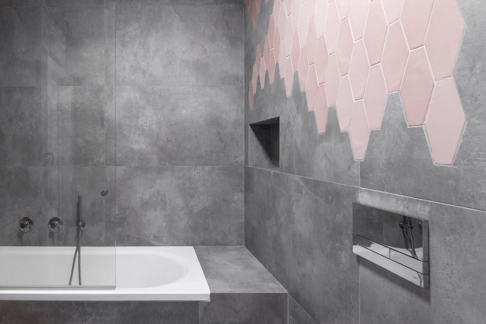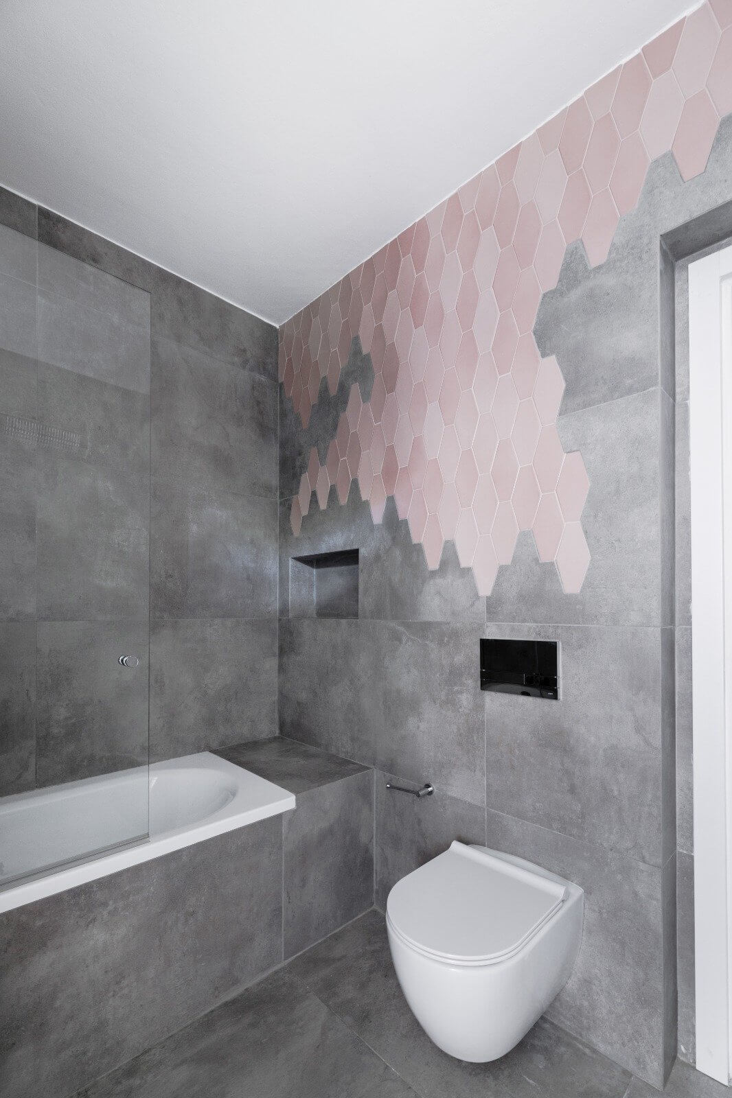 מעצבת הפנים דקל שחף עיצבה דירה מודרנית בעלת שילוב אלמנטים מיוחדים ושילוב גוונים של לבן, אפור ושחור עם נגיעות של גווני ורוד באלמנטים של קרמיקה ייחודית בחדר האמבטיה.